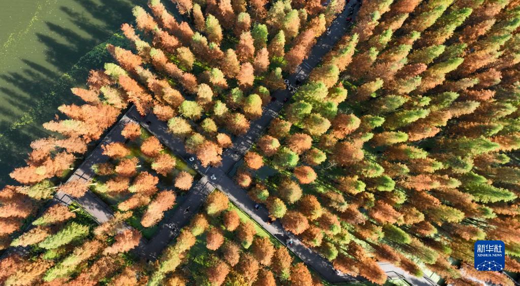 11月28日,游客在貴州省遵義市播州區播雅濕地公園觀(guān)賞水杉(無(wú)人機照片)。