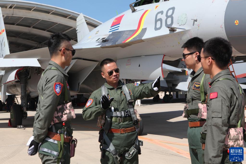 海軍航空大學(xué)某基地晝間飛行結束后,飛行教官王勇(左二)為學(xué)員們講評著(zhù)艦動(dòng)作(9月18日攝)。新華社發(fā)(周剛 攝)