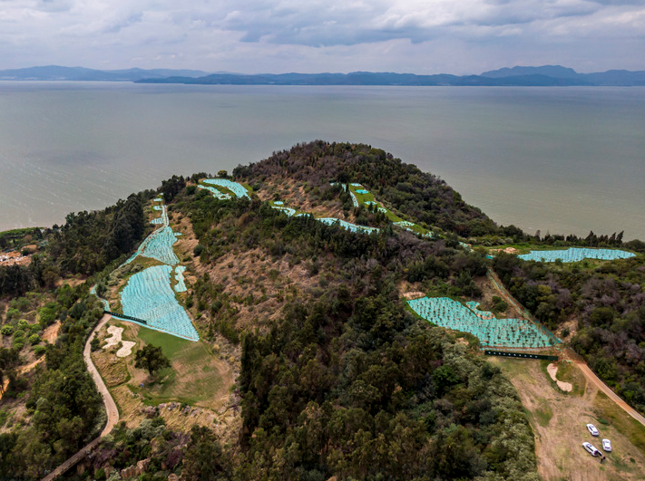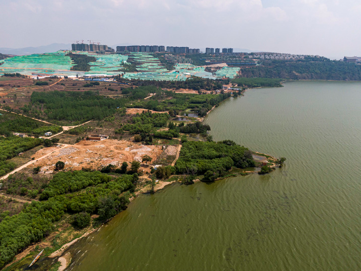 空中遠眺滇池邊的長(cháng)腰山(2021年4月26日攝 無(wú)人機照片)