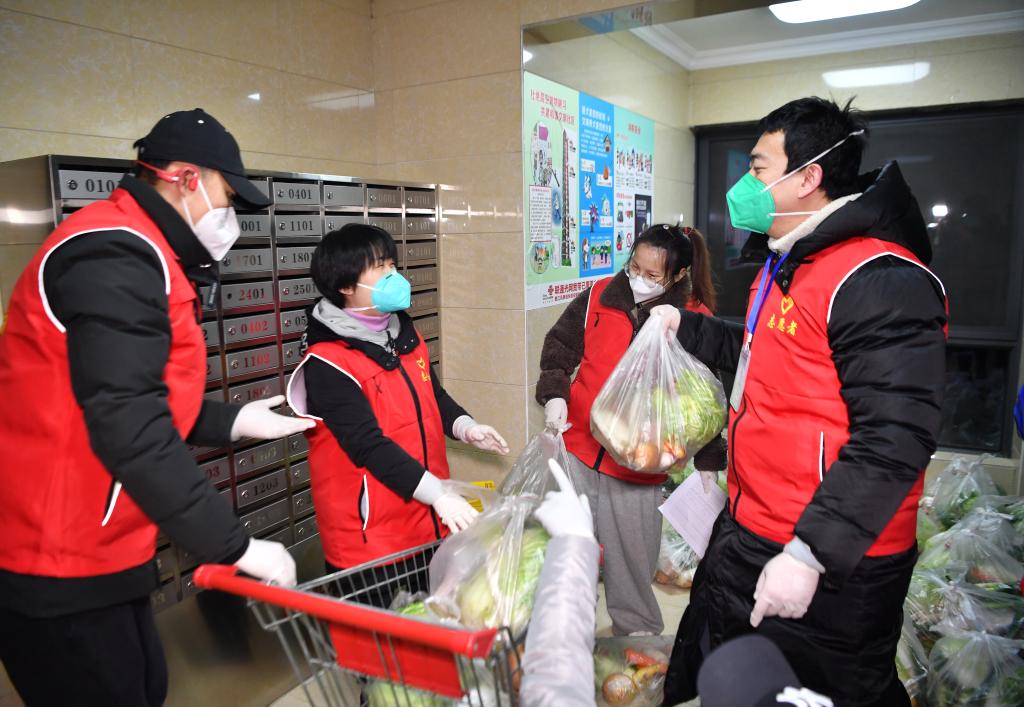2021年12月31日,西安曲江風(fēng)景線(xiàn)小區,志愿者分揀免費生活物資。新華社記者 張博文 攝