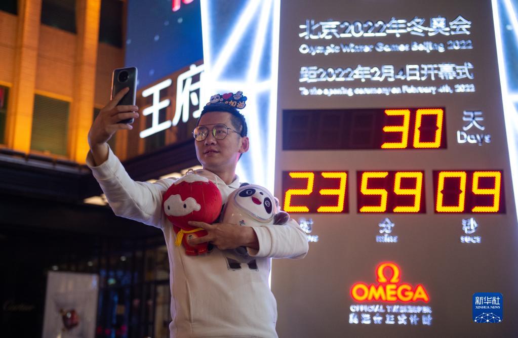 1月4日,一位市民在位于北京王府井大街的北京2022年冬奧會(huì )倒計時(shí)牌前自拍。新華社記者 陳鐘昊 攝