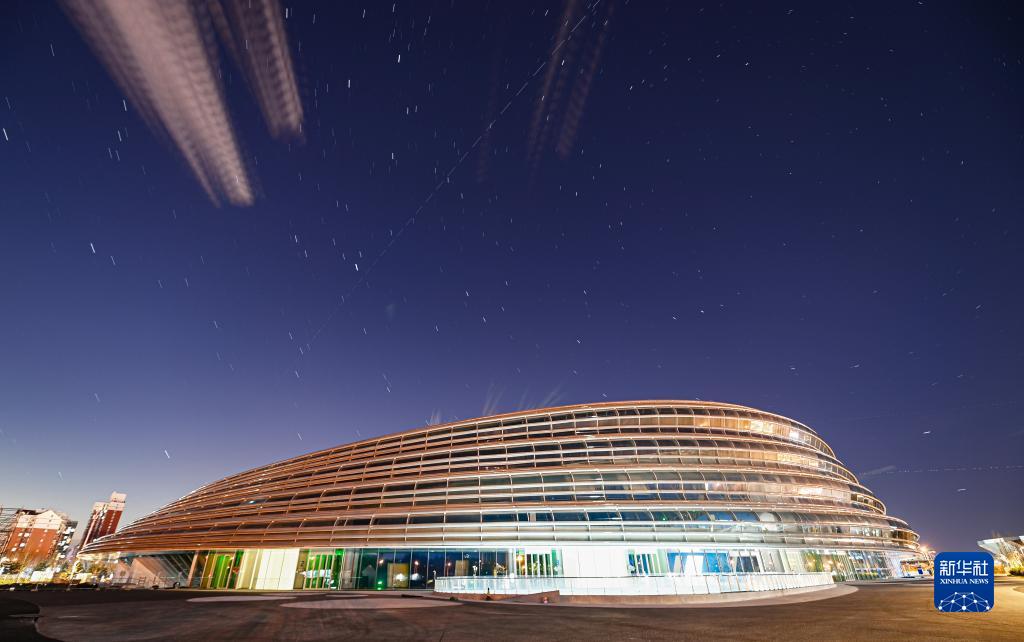 這是2021年12月16日在國家速滑館“冰絲帶”外拍攝的中國空間站過(guò)境照片(軌跡為多張照片堆棧)。新華社記者 陳曄華 攝