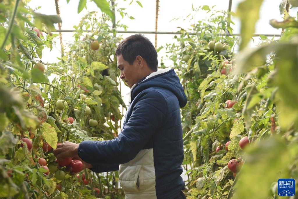 新疆葉城縣阿克塔什鎮居民吐遜馬木提·依明在自己承包的大棚中采摘西紅柿(2021年11月19日攝)。新華社記者 顧煜 攝