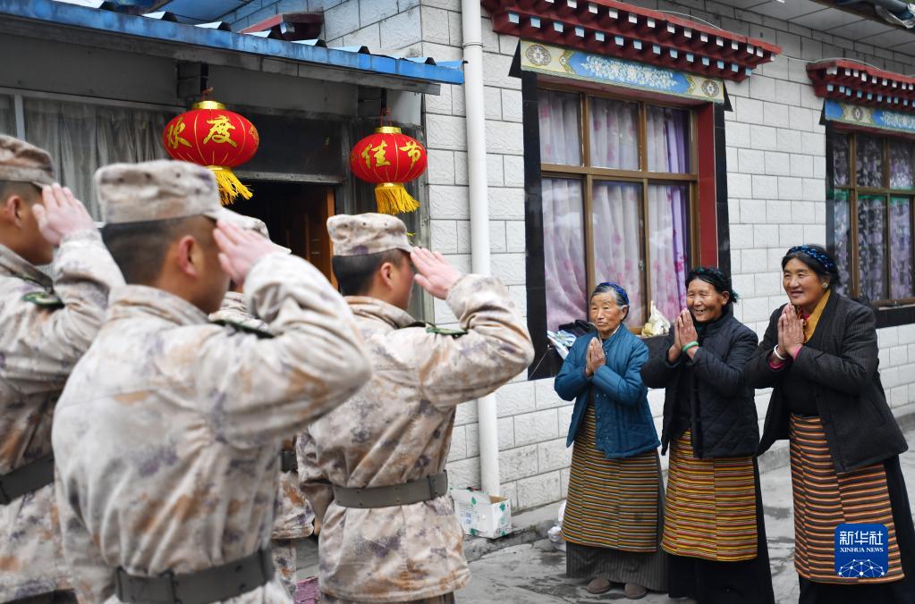 這是官兵們向三位老阿媽敬禮,老阿媽感謝解放軍(1月26日攝)。新華社記者 覺(jué)果 攝
