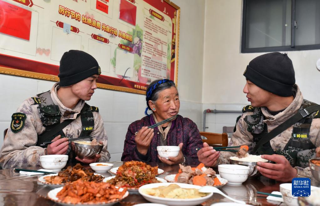 次仁曲珍老人在哨所與戰士一起吃飯時(shí),講述過(guò)去送菜的經(jīng)歷(1月27日攝)。新華社記者 覺(jué)果 攝