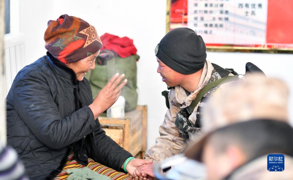 老阿媽達吉在和戰士聊家常(1月27日攝)。新華社記者 覺(jué)果 攝