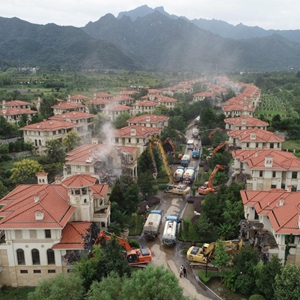 大型機械在陜西省西安市長(cháng)安區秦嶺違建別墅群“群賢別業(yè)”內進(jìn)行拆除工作(2018年9月6日攝,無(wú)人機照片)。新華社記者 邵瑞 攝