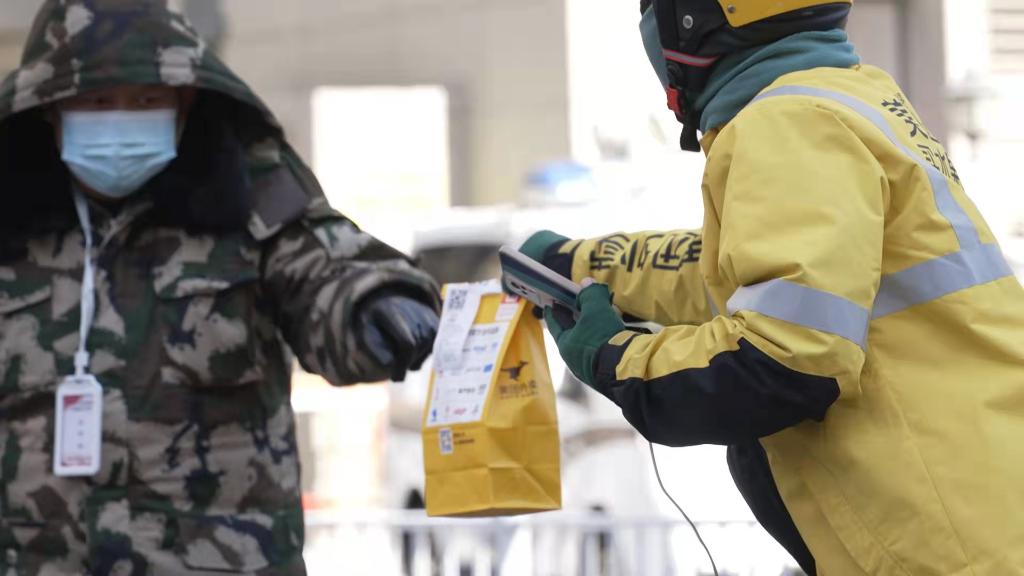 2月20日,內蒙古呼和浩特市的外賣(mài)騎手將餐食交給疫情防控工作者。新華社記者達日罕 攝