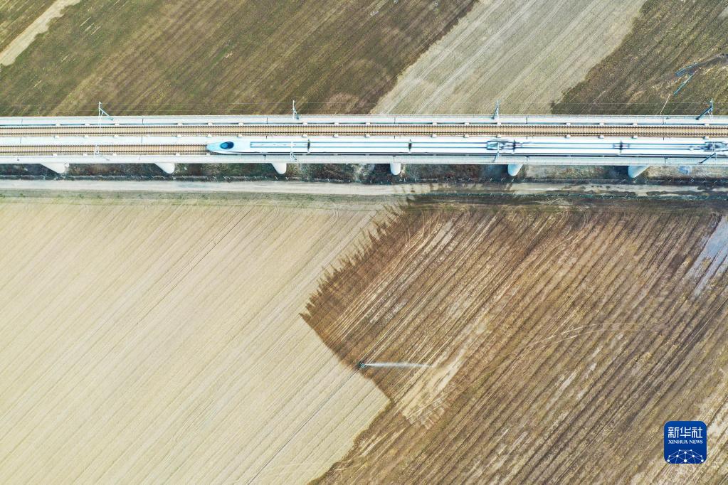 2月22日,高地隙植保機在山西省運城市芮城縣新村作業(yè)(無(wú)人機照片)。新華社記者 柴婷 攝