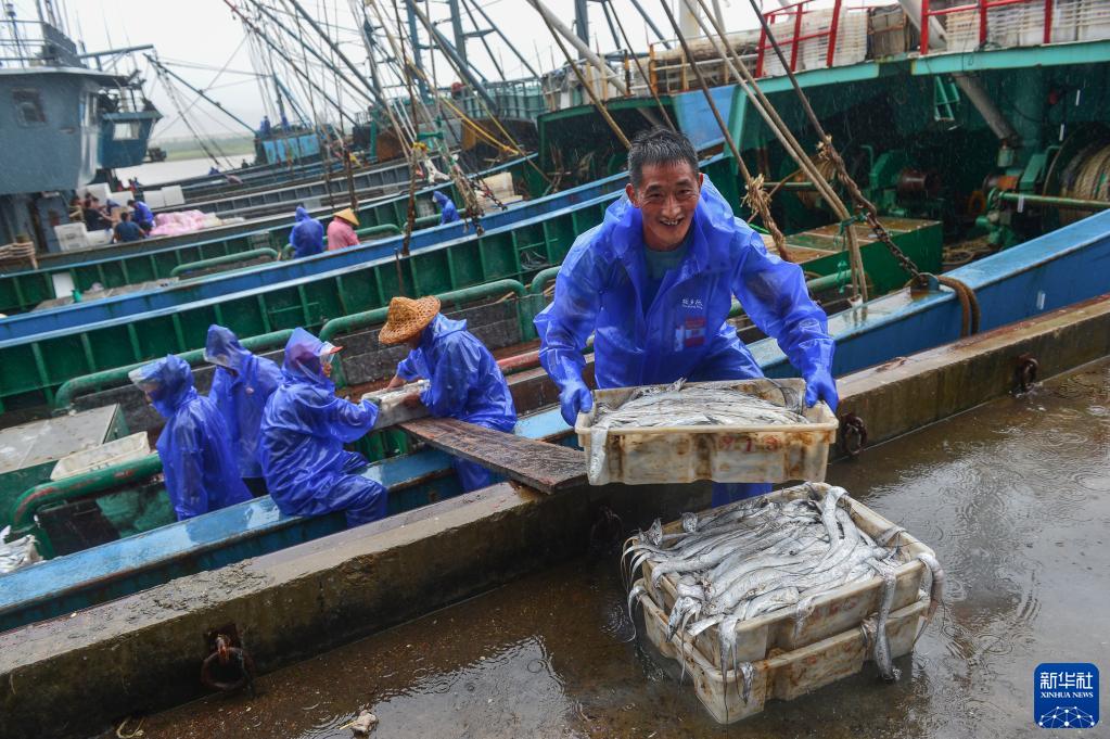 臺州市三門(mén)縣健跳漁港碼頭,漁民從歸港的漁船上卸下漁獲(2021年9月12日攝)。新華社發(fā)(林利軍攝)
