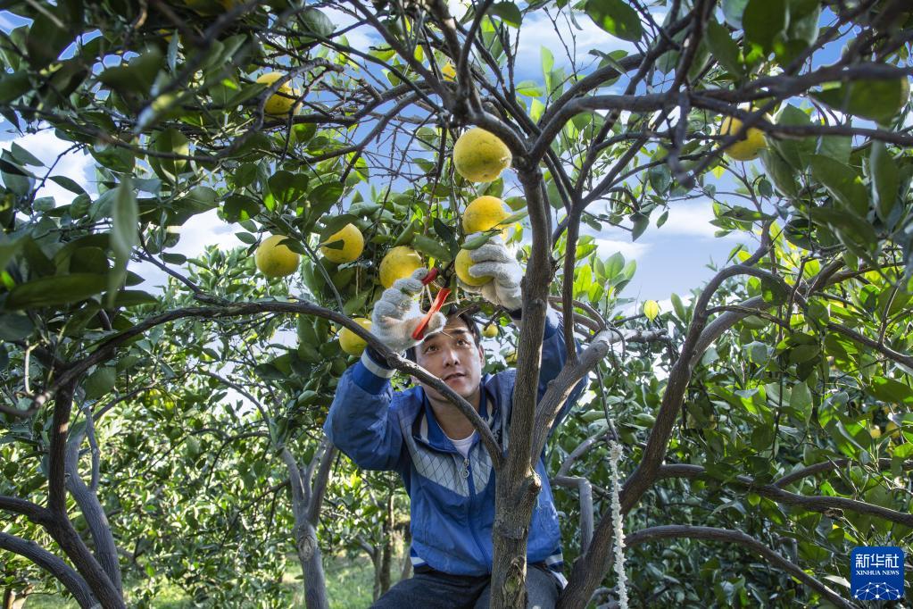 果農在浙江省衢州市常山縣太公山胡柚基地采摘胡柚(2021年11月10日攝)。新華社發(fā)(陳勤幸攝)