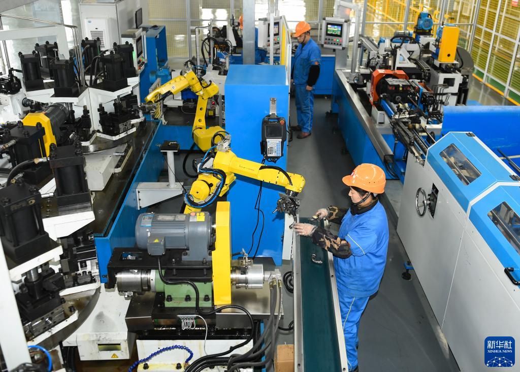在位于湖州市吳興區八里店鎮的金洲管道科技股份有限公司,工作人員和智能機器人協(xié)作生產(chǎn)不銹鋼管件(2月14日攝)。新華社記者 翁忻旸 攝