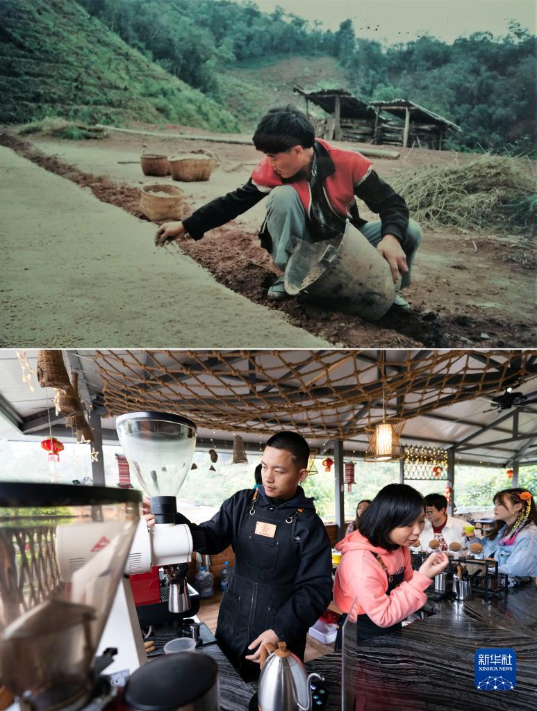 拼版照片:上圖為村民在云南普洱市思茅區小凹子咖啡莊園內進(jìn)行咖啡育苗(資料照片,1997年攝);下圖為咖啡師(左)在云南普洱市思茅區小凹子咖啡莊園內制作咖啡(新華社記者陳欣波2月22日攝)。新華社發(fā)