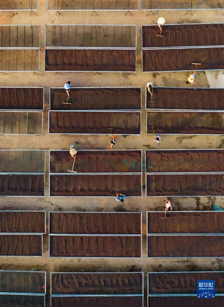 這是云南普洱市思茅區一家企業(yè)的咖啡曬場(chǎng),工作人員在翻曬咖啡(資料圖片)。新華社發(fā)