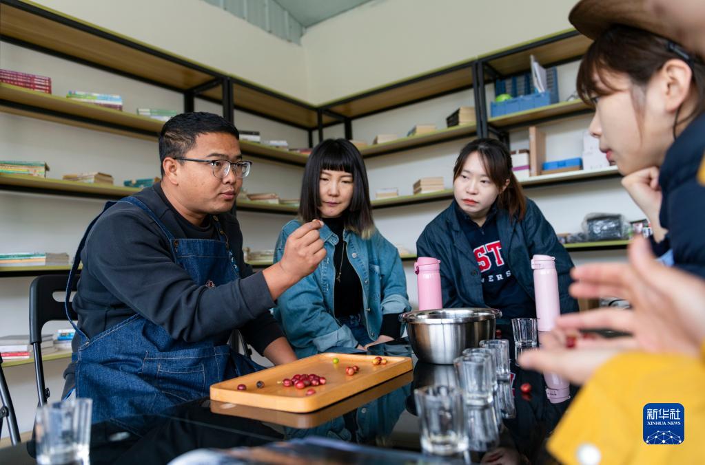 在云南普洱市思茅區野鴨塘河谷咖啡莊園內,楊鴻簡(jiǎn)(左一)在給一群年輕人介紹咖啡知識(2月23日攝)。新華社記者 陳欣波 攝