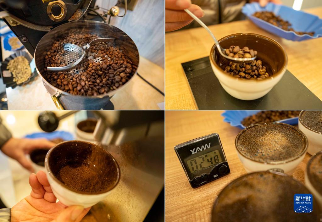 在云南普洱奧萊咖啡有限公司內,工作人員在加工收購的本地咖啡準備進(jìn)行杯測:左上圖為咖啡烘焙機在晾涼咖啡豆;右上圖為稱(chēng)重咖啡豆;左下圖為磨咖啡豆;右下圖為沖好的等待杯測的咖啡(2月22日攝)。新華社記者 陳欣波 攝