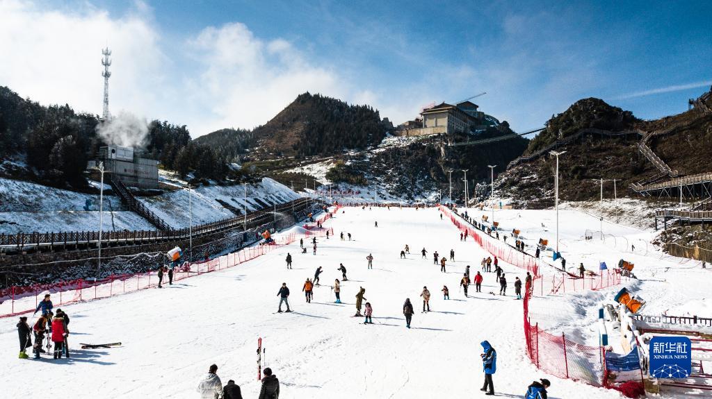 游客在六盤(pán)水市梅花山國際滑雪場(chǎng)享受滑雪樂(lè )趣(2019年1月16日攝,無(wú)人機照片)。新華社記者 陶亮 攝