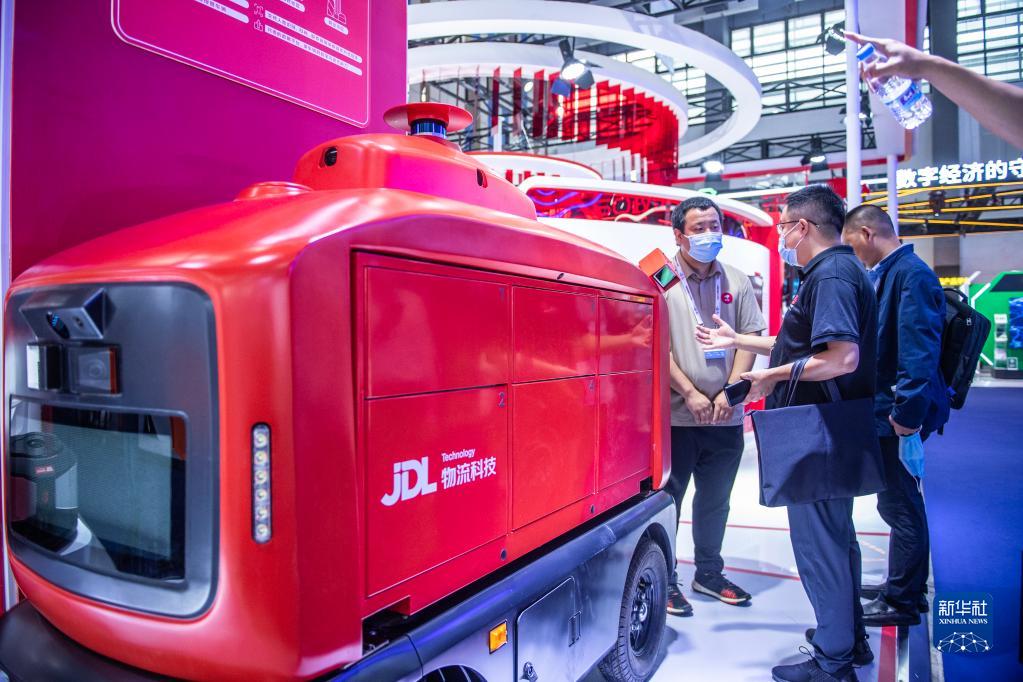 參會(huì )者在2021中國國際大數據產(chǎn)業(yè)博覽會(huì )上了解無(wú)人駕駛快遞運輸車(chē)(2021年5月26日攝)。新華社記者 陶亮 攝