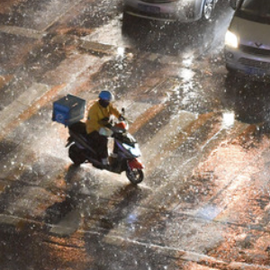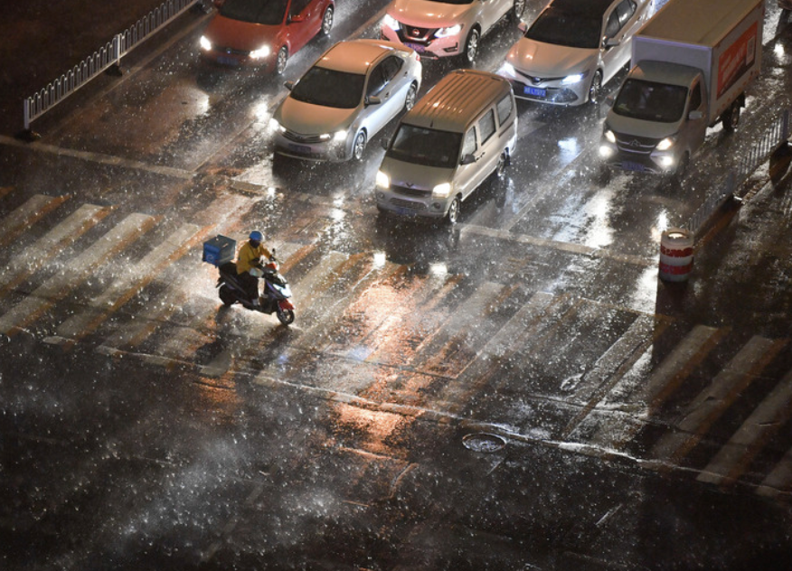 2021年4月15日傍晚,在天津市南開(kāi)區,外賣(mài)騎手在風(fēng)雨中騎行過(guò)馬路。新華社發(fā)(孫凡越 攝)