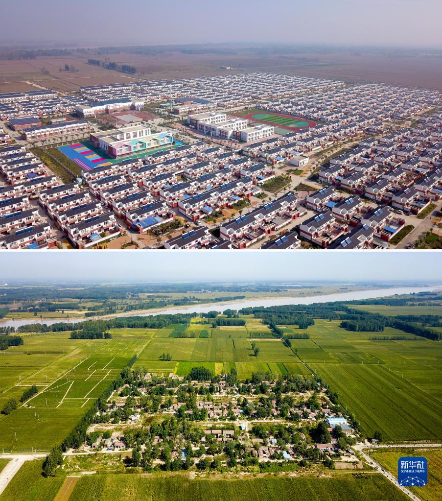 拼版照片的上圖為山東省菏澤市鄄城縣舊城鎮安置王莊村等灘區群眾的六合社區(2021年10月13日攝,無(wú)人機照片);下圖為遷建之前的菏澤市鄄城縣舊城鎮王莊村舊址,現已復墾(2020年9月20日攝,無(wú)人機照片)。新華社記者 郭緒雷攝