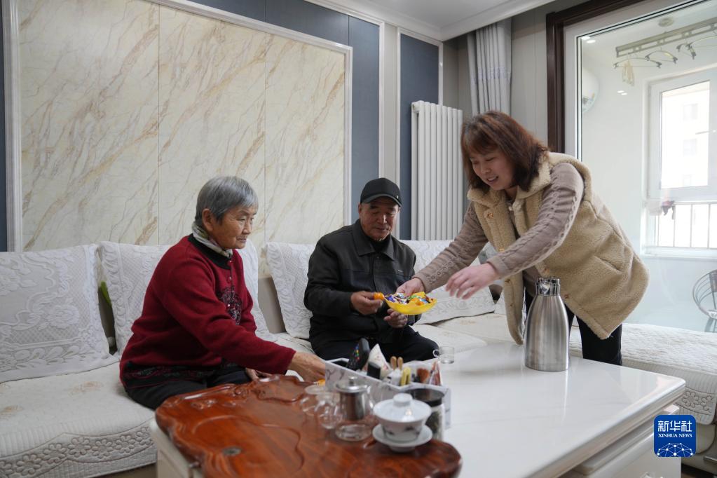 山東省濟南市長(cháng)清區孝里街道居民于家云(中)、朱存紅夫婦和兒媳婦安風(fēng)芹(右)在遷入的新居中(4月8日攝)。新華社記者朱崢攝