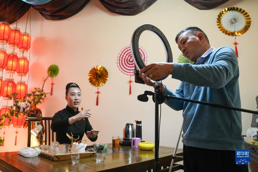 山東省濟南市長(cháng)清區孝里街道居民馮辛華(右)、徐金玉夫婦在自己經(jīng)營(yíng)的茶葉店里準備直播(4月8日攝)。新華社記者朱崢攝