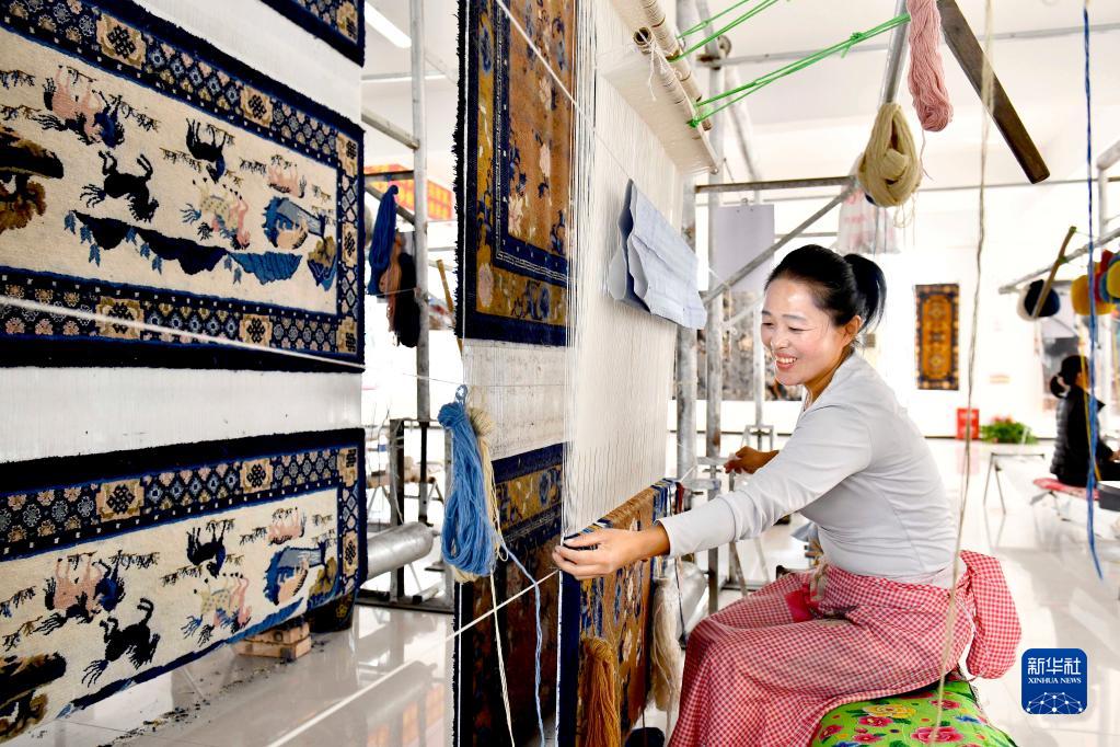 村民在山東省菏澤市鄄城縣六合社區鄉村振興創(chuàng )業(yè)車(chē)間加工地毯(2021年10月13日攝)。新華社記者 郭緒雷攝