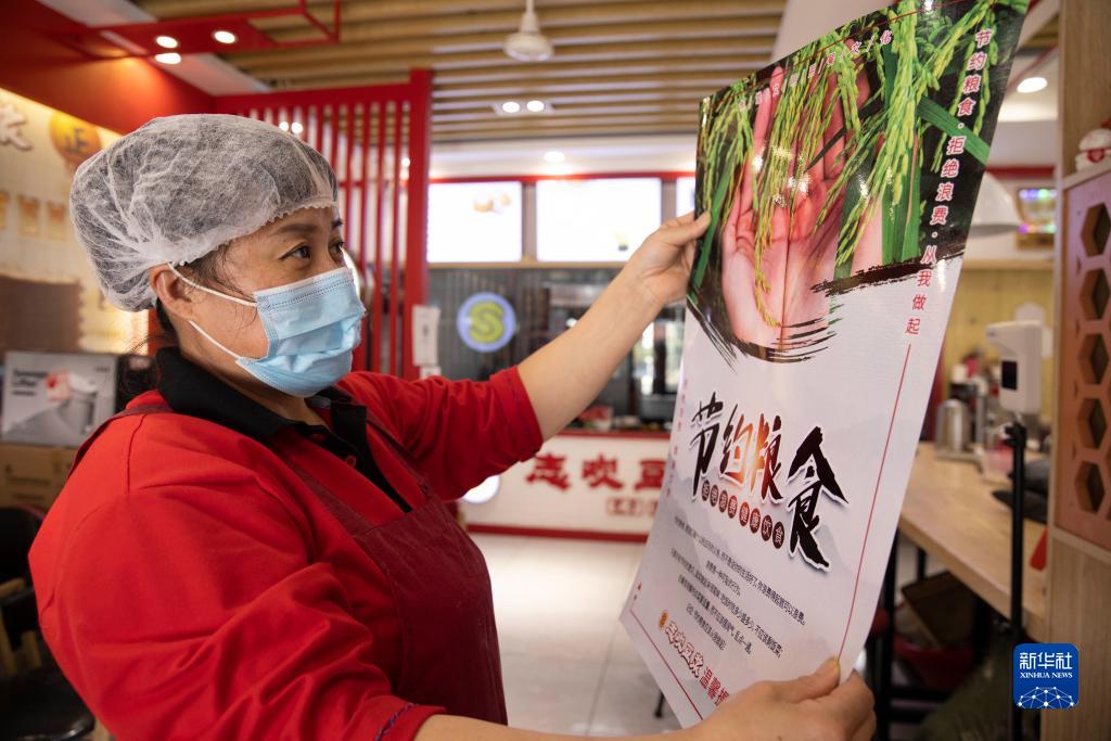 4月28日,在哈爾濱市道里區一家飯店,工作人員準備張貼節約糧食宣傳畫(huà)。新華社記者 張濤 攝