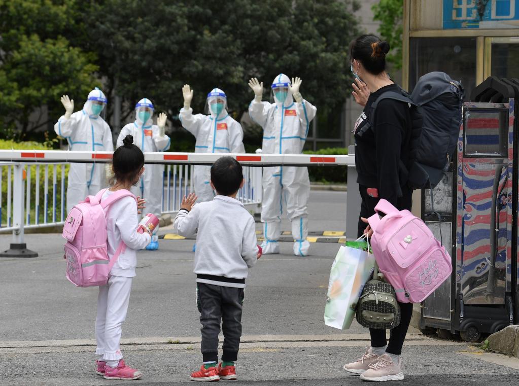 4月30日,由上海交通大學(xué)醫學(xué)院附屬仁濟醫院南部院區收治的3歲重癥新冠患者小華(化名)出院。走出醫院準備回家時(shí),小華(前中)和姐姐、媽媽?zhuān)ㄓ乙唬┮黄鸹厣硐蜥t護人員道別。新華社記者李賀 攝
