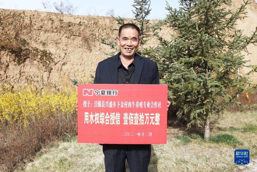 寧夏固原市涇源縣興盛鄉下金村養牛大戶(hù)于建輝通過(guò)抵押用水權證獲得110萬(wàn)元貸款(4月21日攝)。新華社記者 盧鷹 攝