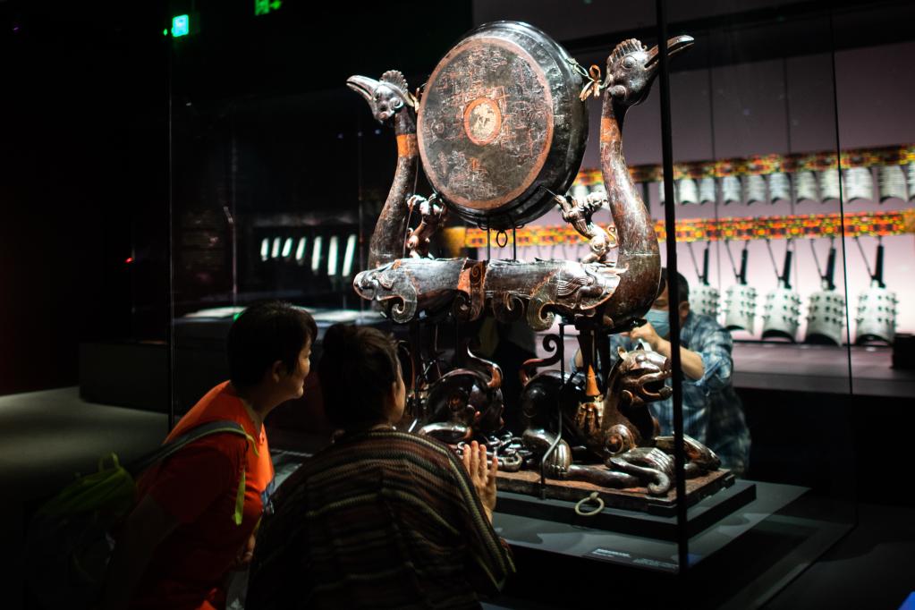 5月12日,參觀(guān)者在湖北省博物館觀(guān)看彩繪漆木虎座鳥(niǎo)架鼓。新華社記者肖藝九攝