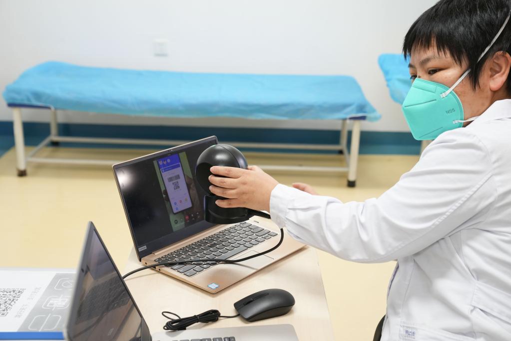 5月22日,在北京市豐臺區盧溝橋社區衛生服務(wù)中心,醫務(wù)工作者通過(guò)視頻連線(xiàn)的方式為預約上門(mén)治療的患者掃描電子醫???。(新華社記者鞠煥宗 攝)
