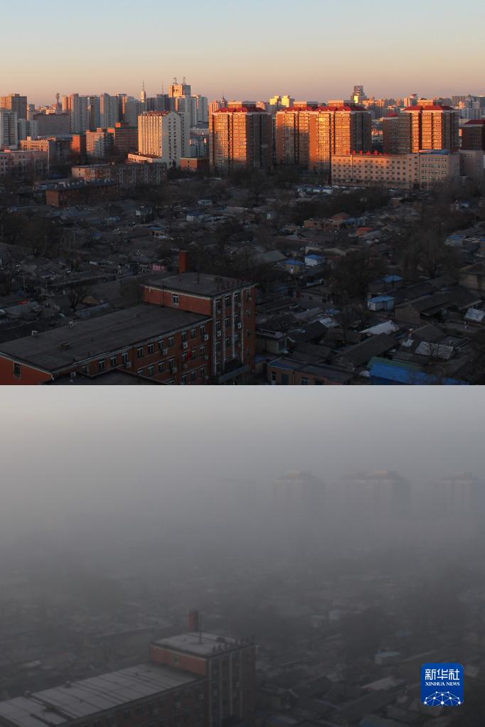 拼版照片:上圖為2013年1月11日,北京一座立交橋旁的建筑籠罩在大霧中(新華社記者何俊昌攝);下圖為2022年6月6日拍攝的北京西二環(huán)一座立交橋附近的街景(新華社記者陳曄華攝)。新華社發(fā)