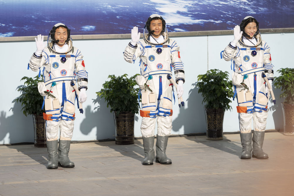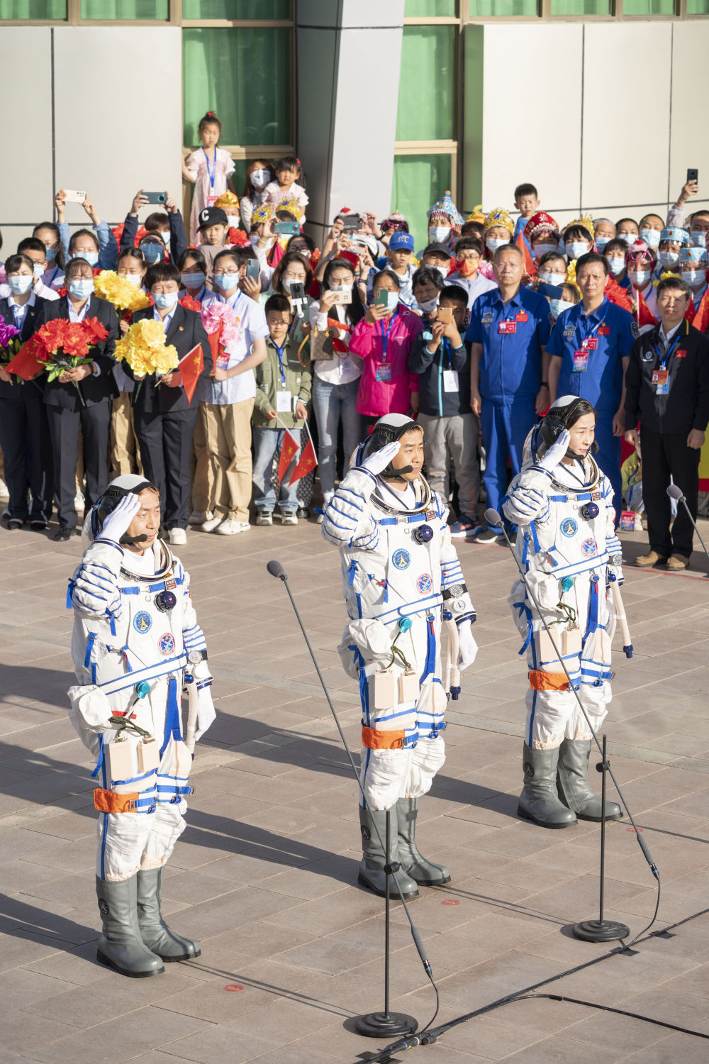 6月5日,神舟十四號載人飛行任務(wù)航天員乘組出征儀式在酒泉衛星發(fā)射中心問(wèn)天閣廣場(chǎng)舉行。陳冬(右)、劉洋(中)、蔡旭哲即將開(kāi)啟為期6個(gè)月的飛行任務(wù)。