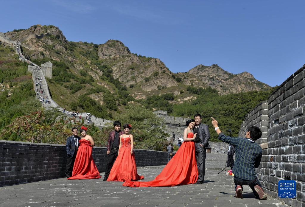 新人在山海關(guān)角山長(cháng)城拍照(2012年10月5日攝)。 新華社記者楊世堯 攝