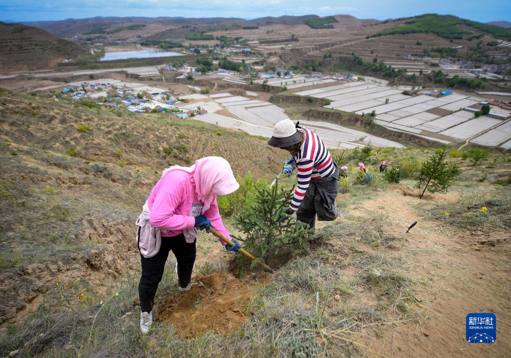 5月18日,人們在寧夏固原市西吉縣硝河鄉栽植云杉。新華社記者 馮開(kāi)華 攝