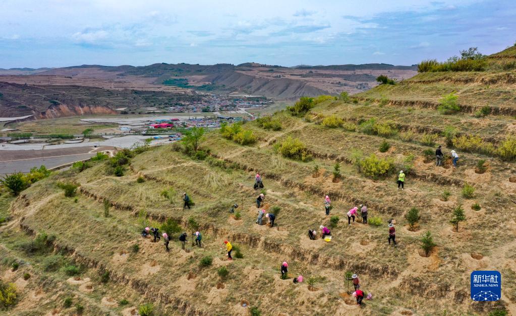 5月18日,人們在寧夏固原市西吉縣硝河鄉栽植苗木(無(wú)人機照片)。新華社記者 馮開(kāi)華 攝