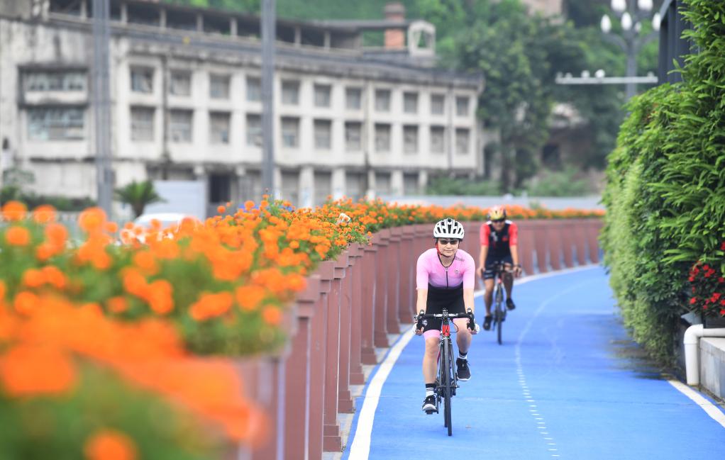 (市民在重慶市江北區北濱路漫行步道的自行車(chē)道上騎行)