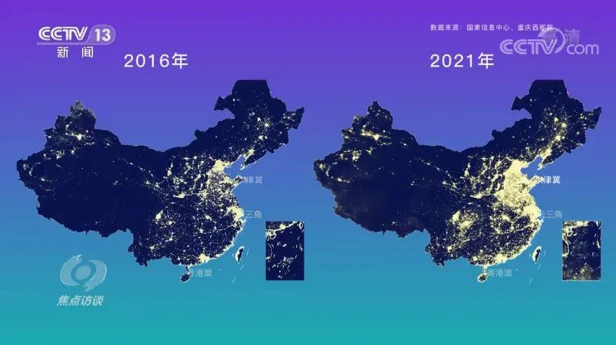 △5年間,中國經(jīng)濟體量穩步增長(cháng),而體現經(jīng)濟活躍度的燈光帶,向著(zhù)粵港澳大灣區、長(cháng)三角、京津冀等幾個(gè)區域集中呈明顯特點(diǎn)。(國家信息中心供圖)