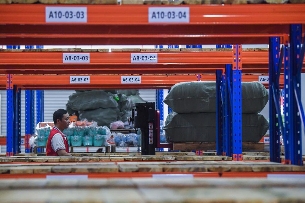 6月27日,在義烏市蘇溪鎮愛(ài)德瑪電商園的“小眾云倉”站點(diǎn)內,工作人員在搬運等待發(fā)貨的電商貨物。新華社記者徐昱 攝