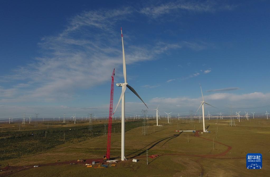 在河北張家口市張北縣大河鄉,工人在一處風(fēng)電場(chǎng)安裝風(fēng)力發(fā)電機(2020年9月15日攝,無(wú)人機照片)。新華社記者 楊世堯 攝