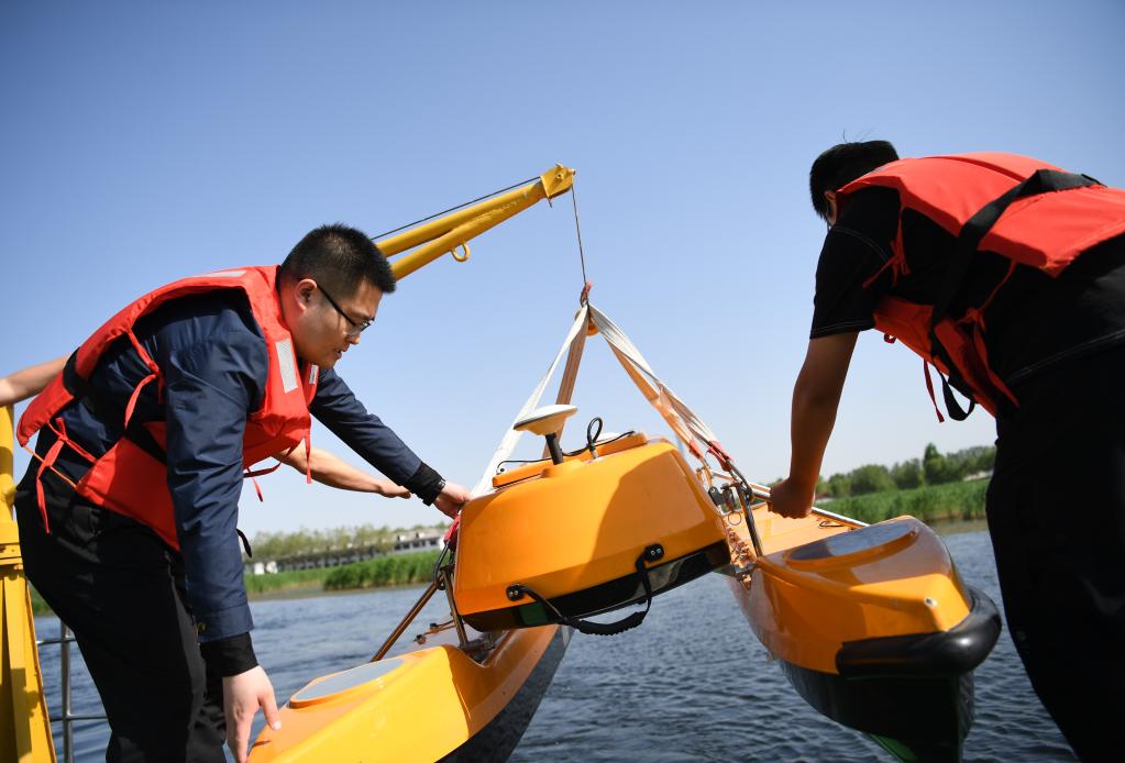 工作人員準備把水質(zhì)監測無(wú)人船下放白洋淀水面。(新華社記者 朱旭東 攝)