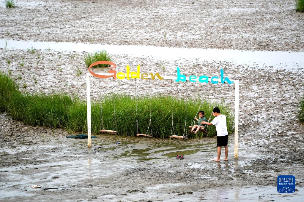 游人在江蘇省啟東市黃金海灘景區內的黃海灘涂上休閑娛樂(lè )(2022年7月16日攝)。新華社記者 季春鵬 攝