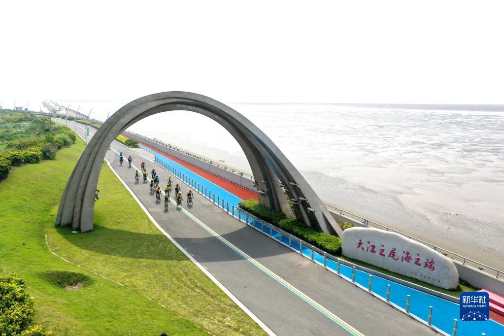 游人在江蘇省啟東市江海文化景觀(guān)大道騎行(2022年7月17日攝,無(wú)人機照片)。新華社記者 季春鵬 攝