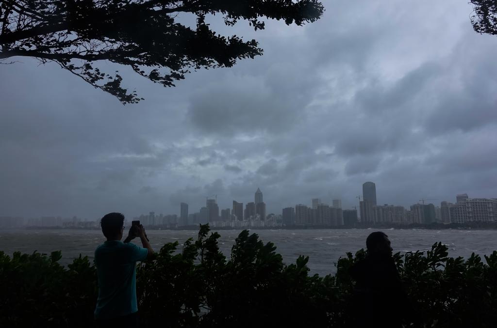 2021年10月13日,市民在??谑斜@醒牒0杜臄z臺風(fēng)“圓規”登陸情況。新華社記者 楊冠宇 攝