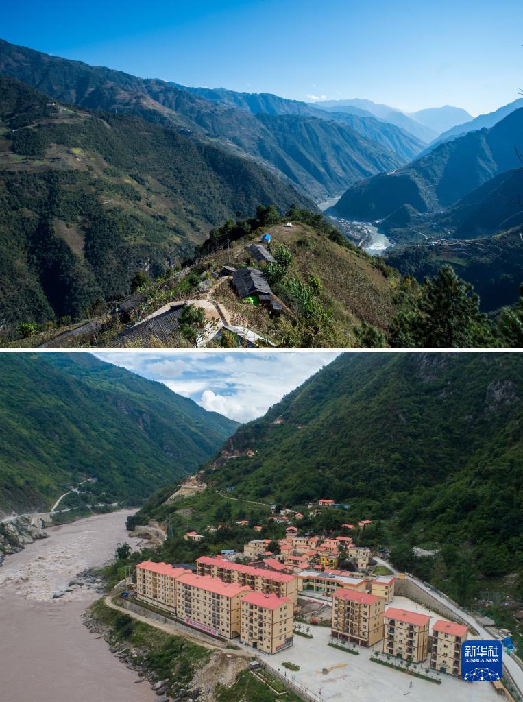 拼版照片:上圖是云南福貢縣匹河鄉托坪村一景(2016年11月25日攝);下圖是搬遷到怒江邊的托坪村五湖易地扶貧搬遷安置點(diǎn)新村(2019年6月25日攝,無(wú)人機照片)。新華社記者 胡超 攝