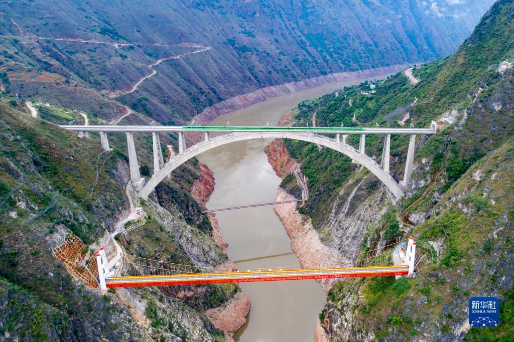 復興號列車(chē)通過(guò)大瑞鐵路大保段瀾滄江特大橋,紅色橋梁為中緬油氣管道橋,下方為霽虹橋,呈現三橋并跨瀾滄江景觀(guān)(2022年7月22日攝,無(wú)人機照片)。新華社記者 陳欣波 攝