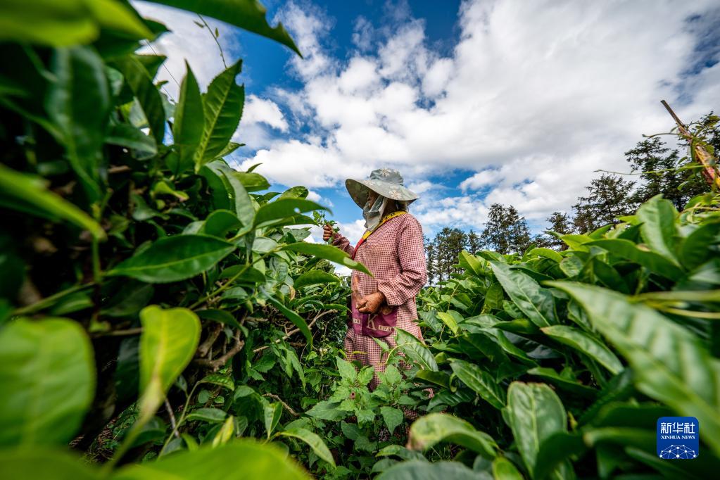 茶農在位于云南省西雙版納傣族自治州勐??h的國家種質(zhì)大葉茶樹(shù)資源圃采茶(2022年5月10日攝)。新華社記者 江文耀 攝