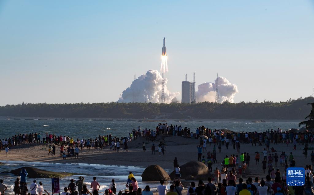 游客在文昌淇水灣海邊觀(guān)看長(cháng)征五號B運載火箭在文昌航天發(fā)射場(chǎng)點(diǎn)火升空(2020年5月5日攝)。新華社記者 郭程 攝