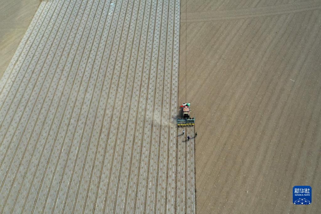 在新疆生產(chǎn)建設兵團第六師共青團農場(chǎng)的棉田里,職工操作搭載北斗導航系統的播種機進(jìn)行春播(2022年4月19日攝,無(wú)人機照片)。新華社記者 丁磊 攝